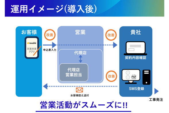 従来の申込書は記入・郵送や不備対応、サービス変更時の印刷などで時間とコストがかかっていました。この営業支援アプリは kintone を基盤に、クラウドとタブレットで申込が完結。サービス変更も反映でき、印刷不要。営業の滞在時間を短縮し、対応件数を増やしながら、不備や紛失リスクをゼロにします。「スピード」「正確さ」「柔軟性」で営業を進化させる、kintone連携のアプリです。